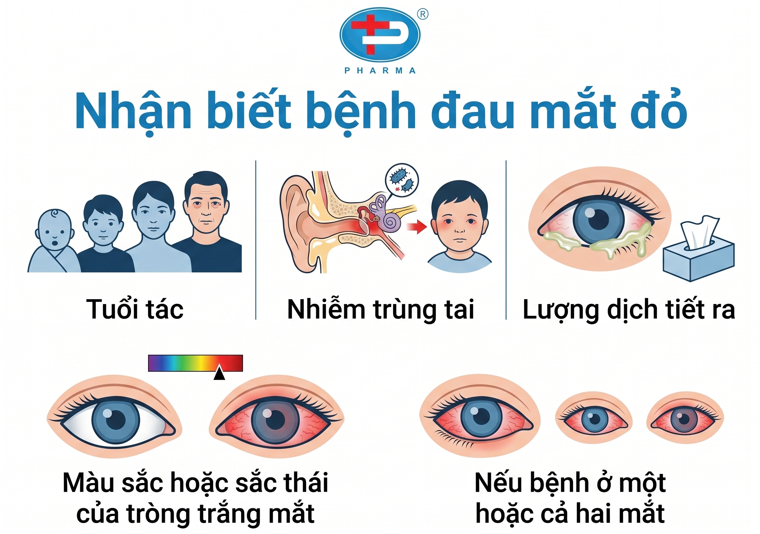 Ngoài ra, bản thân người bệnh cũng có thể phân biệt được tình trạng đau mắt đỏ do virus hay vi khuẩn gây ra. Từ đó cung cấp cho bác sĩ khi đi khám bệnh để bác sĩ dễ dàng tầm soát và điều trị chính xác. Nhận biết bệnh đau mắt đỏ bằng những yếu tố đơn giản như: