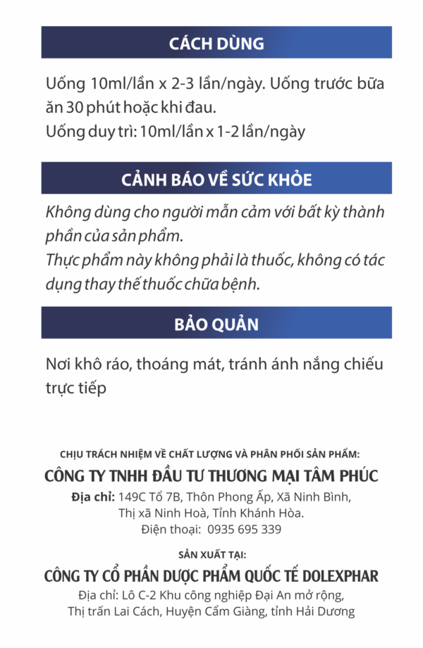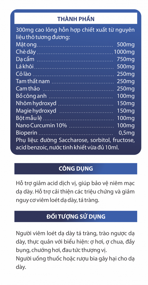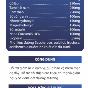 - Giúp bảo vệ niêm mạc, hỗ trợ cải thiện triệu chứng viêm loét dạ dày, tá tràng
