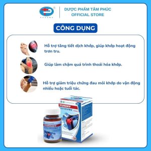 Công dụng: Bổ sung các chất hỗ trợ tang tạo dịch nhờn cho khớp, hỗ trợ hồi phục mô sụn khớp, giúp khớp vận động linh hoạt.